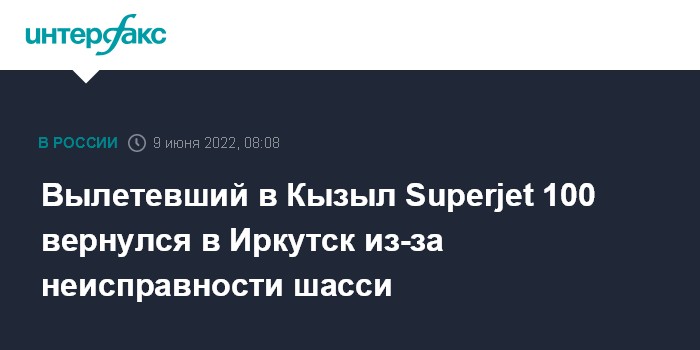Москва. 9 июня. INTERFAX.RU - Самолет Sukhoi Superjet 100 авиакомпании "ИрАэро", вылетевший в четверг утром из Иркутска в Кызыл, вернулся в аэропорт вылета, сообщили "Интерфаксу" в пресс-службе "ИрАэро".