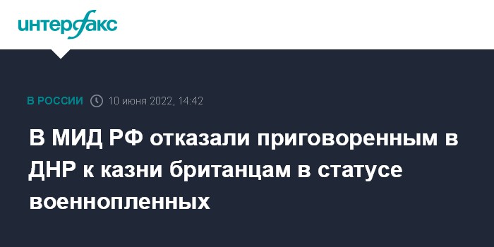 Москва. 10 июня. INTERFAX.RU - Приговоренные к смертной казни в ДНР британцы в соответствии с международным гуманитарным правом не являются комбатантами и не имеют права на статус военнопленного, заявила официальный представитель МИД РФ Мария Захарова.