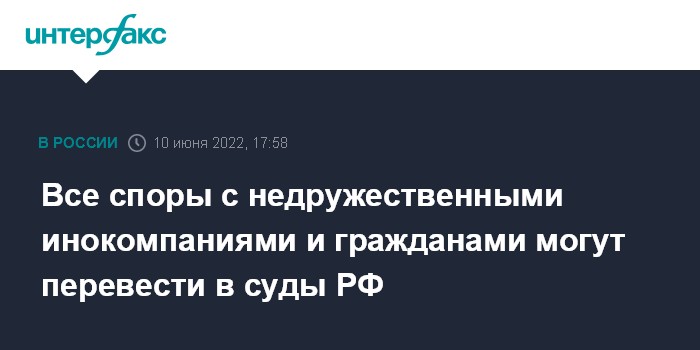 Москва. 10 июня. INTERFAX.RU - Российские суды должны рассматривать все споры отечественных компаний и граждан РФ с иностранными лицами из недружественных государств - это предусматривает внесенный в Госдуму законопроект депутата Романа Лябихова (КПРФ). Согласно документу, это правило действует, даже если спорящие стороны изначально договорились о разрешении конфликтов в иностранном суде или международном арбитраже.