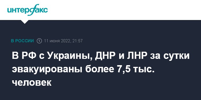 Москва. 11 июня. INTERFAX.RU - В течение минувших суток на территорию России из ДНР и ЛНР, украинских населенных пунктов вывезены более 7,5 тыс. человек, сообщил начальник Национального центра управления обороной РФ Михаил Мизинцев на брифинге в субботу.