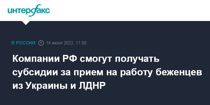 Москва. 14 июня. INTERFAX.RU - Беженцы из Украины, ДНР и ЛНР могут приниматься на работу в РФ по программе субсидирования найма, заявил премьер-министр РФ Михаил Мишустин.