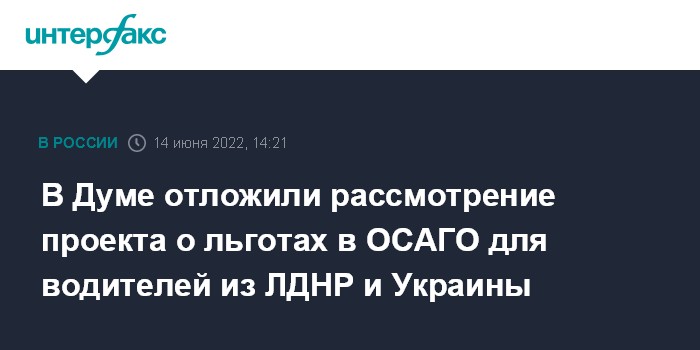 Москва. 14 июня. INTERFAX.RU - Рассмотрение законопроекта с поправками в закон об ОСАГО, которые предоставляют льготы для автовладельцев-физлиц, прибывших в Россию с территории Луганской и Донецкой народных республик, а также с территории Украины, отложено. Об этом сообщил "Интерфаксу" источник в аппарате парламента. Предполагалось, что на рассмотрение во втором чтении документ будет вынесен во вторник.
