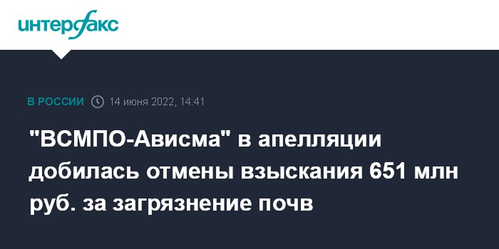 Москва. 14 июня. INTERFAX.RU - Семнадцатый арбитражный апелляционный суд (Пермь) во вторник отменил решение суда первой инстанции о взыскании с ПАО "Корпорация "ВСМПО-Ависма" более 651 млн рублей за вред, причиненный почвам, передает корреспондент "Интерфакса" из зала суда.