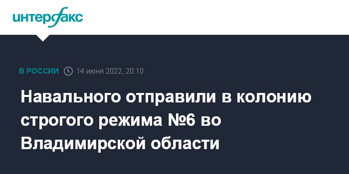 Москва. 14 июня. INTERFAX.RU - Оппозиционер Алексей Навальный во вторник был этапирован в колонию строгого режима во Владимирской области, сообщил "Интерфаксу" председатель Общественной наблюдательной комиссии региона Сергей Яжан.