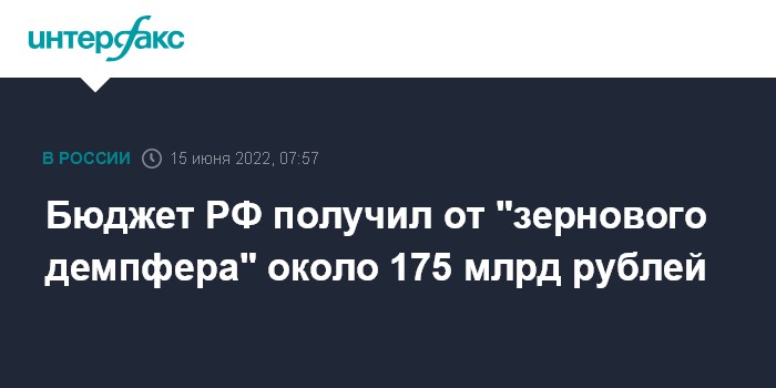 Москва. 15 июня. INTERFAX.RU - Бюджет РФ получил от "зернового демпфера" около 175 млрд рублей, сообщила вице-премьер Виктория Абрамченко.