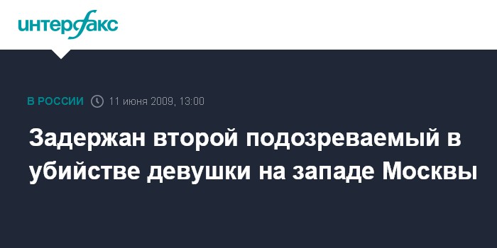 Москва. 11 июня. INTERFAX.RU - В четверг сотрудники уголовного розыска Западного округа столицы задержали второго подозреваемого в убийстве девушки на Очаковской улице, сообщили "Интерфаксу" в управлении информации и общественных связей ГУВД Москвы.