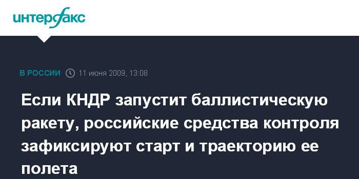 Москва. 11 июня. INTERFAX.RU - В случае запуска Северной Кореей баллистической ракеты средства контроля воздушно-космического пространства России оперативно зафиксируют ее старт и траекторию полета, заявил в четверг "Интерфаксу" замначальника Генштаба Вооруженных сил РФ генерал-полковник Анатолий Ноговицын.