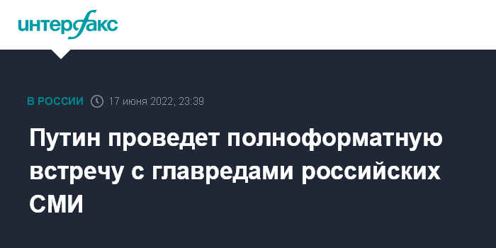 Москва. 17 июня. INTERFAX.RU - Президент РФ Владимир Путин провел встречу с главредами СМИ и военными корреспондентами в укороченном формате из-за подвижек в графике, вызванных DDoS-атаками, полноформатная новая встреча состоится через несколько недель в Москве, сообщил пресс-секретарь российского лидера Дмитрий Песков.