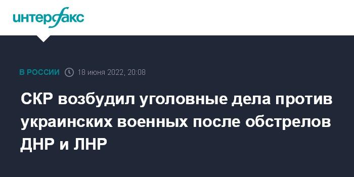 Москва. 18 июня. INTERFAX.RU - Следственный комитет РФ возбудил дела по факту применения запрещенных средств и методов ведения войны против украинских военных после очередных обстрелов Донецкой и Луганской народных республик.