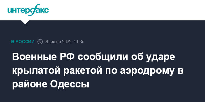 Москва. 20 июня. INTERFAX.RU - Российские военные нанесли удар крылатой ракетой комплекса "Бастион" по аэродрому в районе Одессы, уничтожена станция управления беспилотниками.