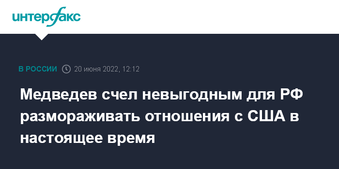 Москва. 20 июня. INTERFAX.RU - Размораживание отношений с США и возобновление диалога с Вашингтоном по теме контроля над стратегическими вооружениями в настоящее время невыгодно для России, считает зампред Совбеза РФ Дмитрий Медведев.
