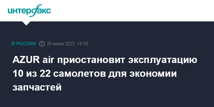 Москва. 20 июня. INTERFAX.RU - Авиакомпания AZUR air приостановит эксплуатацию почти половины оставшихся у нее после введения антироссийских санкций самолетов, следует из письма гендиректора компании Евгения Королева к сотрудникам ("Интерфакс" ознакомился с его содержанием).