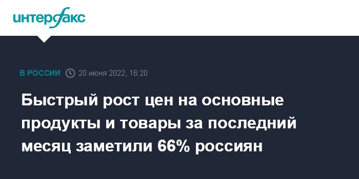 Москва. 20 июня. INTERFAX.RU - Две трети россиян (66%) заявили, что в течение последнего месяца цены на основные продукты питания, непродовольственные товары и услуги повышались быстрее, чем раньше, свидетельствуют данные опроса Фонда "Общественное мнение" (ФОМ), размещённые на официальном сайте социологического центра.