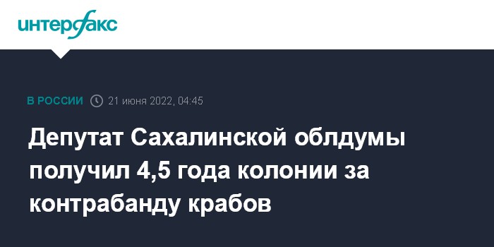 "Фрунзенский районный суд Владивостока вынес приговор по уголовному делу в отношении депутата Сахалинской облдумы - соучастника контрабанды организованной группой из России в Японию, республику Корея и Китайскую Народную Республику живого краба общим весом 3 391 тонны и рыночной стоимостью 2,6 млрд рублей, а также уклонения от уплаты таможенных платежей в размере 9,2 млн рублей", - говорится в сообщении.