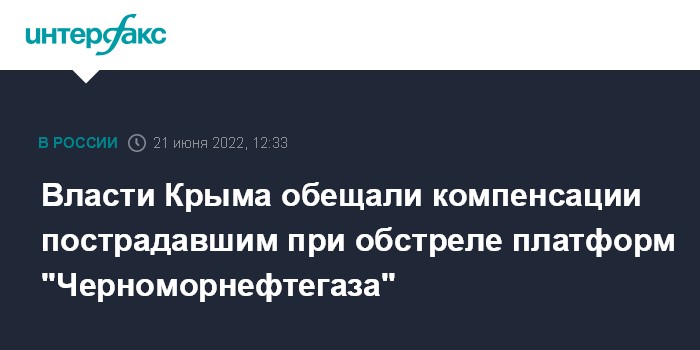 Москва. 21 июня. INTERFAX.RU - Пострадавшие в результате удара Украины по буровым платформам ГУП "Черноморнефтегаз" получат компенсационные выплаты, сообщил председатель Госсовета Крыма Владимир Константинов.