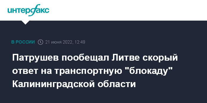 Москва. 21 июня. INTERFAX.RU - Секретарь Совета безопасности РФ Николай Патрушев заявил, что Москва в ближайшее время ответит на решение Вильнюса объявить транспортную "блокаду" Калининградской области, и жители Литвы серьезно ощутят на себе последствия этих мер.