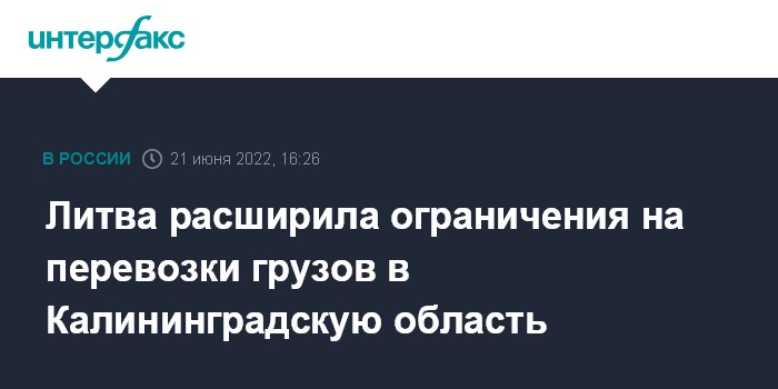 Москва. 21 июня. INTERFAX.RU - Литва распространила ограничения на перевозки санкционных товаров в Калининград и на грузовой автомобильный транзит, сообщили "Интерфаксу" в пресс-службе областного правительства.