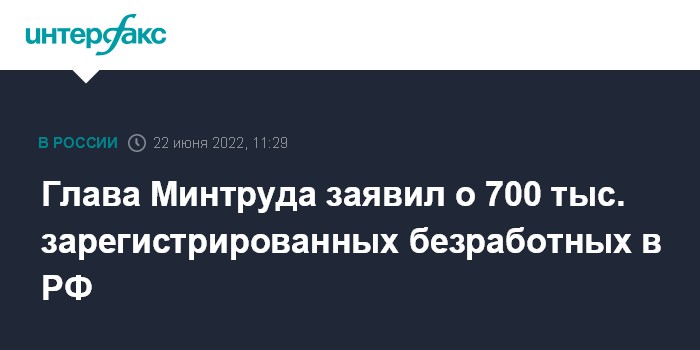 Москва. 22 июня. INTERFAX.RU - Министр труда РФ Антон Котяков сообщил о росте до 700 тысяч числа официально зарегистрированных безработных.