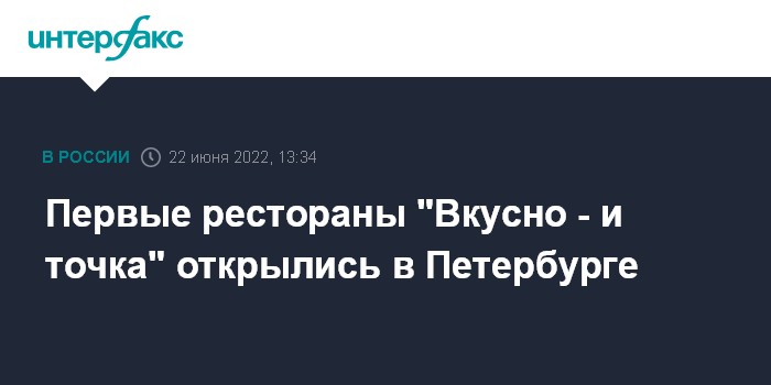 Москва. 22 июня. INTERFAX.RU - Первые рестораны сети "Вкусно - и точка" (бывший McDonald's) начали работу в Петербурге и Ленинградской области в среду.
