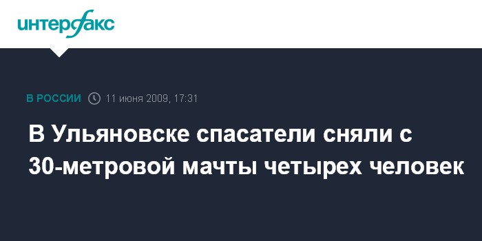 Ульяновск. 11 июня. INTERFAX.RU - Сразу две попытки покорить 30-метровую световую мачту предприняли жители Ульяновска. Как сообщили агентству "Интерфакс" в пресс-службе регионального управления МЧС, два пьяных парня забрались на самый верх мачты, которая стоит у авиазавода в Заволжском районе города. Приехавшие по вызову спасатели потребовали от "верхолазов" спуститься, но те отказались и стали требовать парашют, чтобы спрыгнуть с ним вниз. Их сняли силой и передали прибывшим милиционерам.