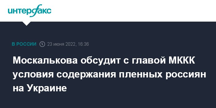 Москва. 23 июня. INTERFAX.RU - Уполномоченный по правам человека в РФ Татьяна Москалькова намерена 24 июня обсудить с главой Международного Красного креста Петером Маурером условия содержания российских военнопленных на Украине.