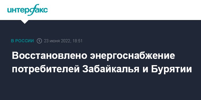 Москва. 23 июня. INTERFAX.RU - Энергоснабжение потребителей в Забайкальском крае и Бурятии восстановлено, сообщило Минэнерго.
