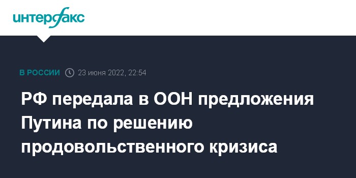 Москва. 23 июня. INTERFAX.RU - Российская сторона положила "на бумагу" все предложения президента Владимира Путина по решению продовольственного кризиса и передала их в ООН, заявил глава МИД РФ Сергей Лавров.