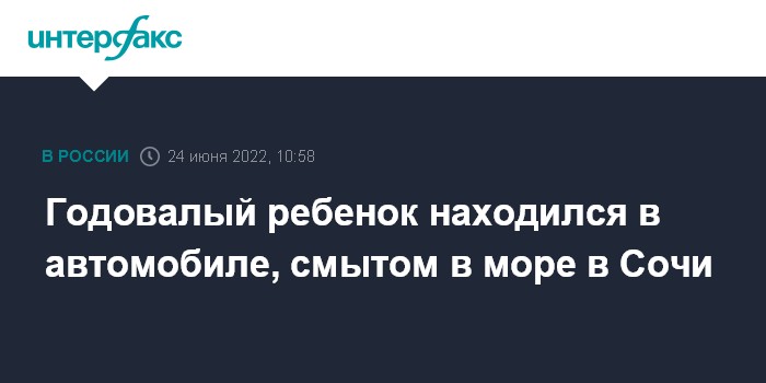 Москва. 24 июня. INTERFAX.RU - В одном из автомобилей, которые унесло в акваторию Черного моря в Сочи, находился годовалый ребенок, сообщили "Интерфаксу" в пресс-службе прокуратуры Краснодарского края.