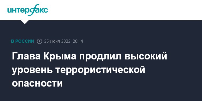 Москва. 25 июня. INTERFAX.RU - Высокий уровень террористической опасности, действующий с апреля в нескольких муниципалитетах Крыма и на ряде гособъектов, продлевается еще на две недели, сообщил глава республики Сергей Аксенов.