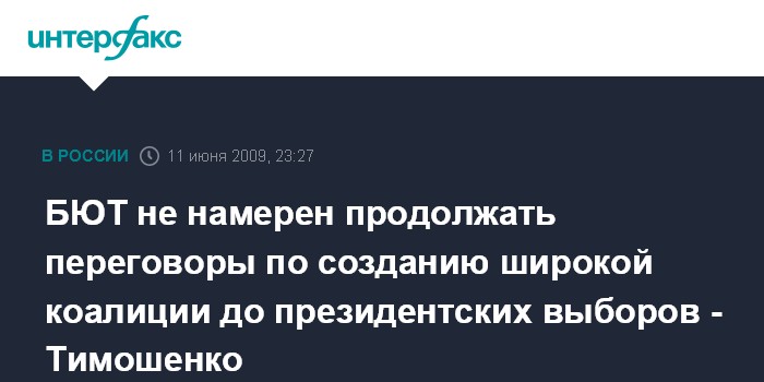 Киев. 11 июня. ИНТЕРФАКС-УКРАИНА - Блок Юлии Тимошенко не будет вести переговоры о создании коалиции с участием всех фракций парламента до президентских выборов, заявляет премьер-министр Украины Юлия Тимошенко.
