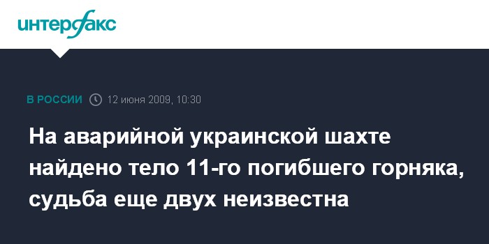 Киев. 12 июня. INTERFAX.RU - В Донецке на шахте им. Скочинского горноспасатели нашли тело 11-го погибшего горняка, сообщила журналистам начальник пресс-службы Территориального управления Госгорпромнадзора по Донецкой области Марина Никитина. Судьба еще двух горняков все еще неизвестна.