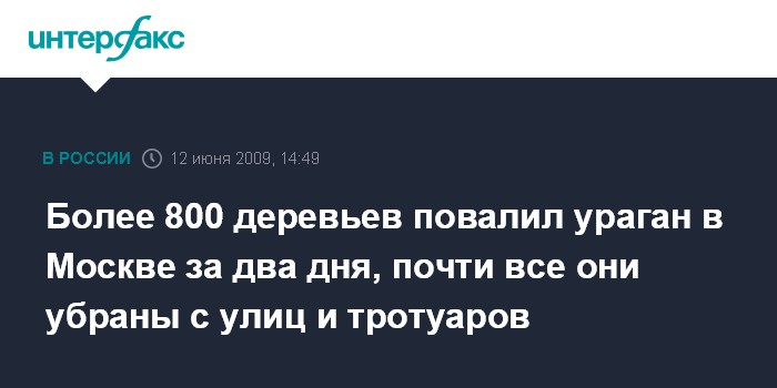 Москва. 12 июня. INTERFAX.RU - В российской столице за двое суток ураганным ветром были повалены 827 деревьев, сообщил "Интерфаксу" в пятницу источник в городских структурах.