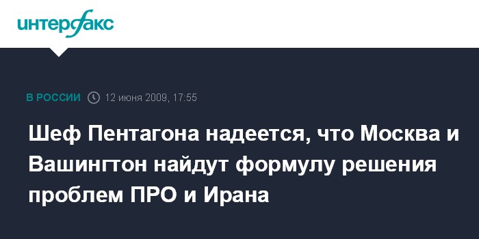 Москва. 12 июня. INTERFAX.RU - Министр обороны США Роберт Гейтс выразил надежду, что Америка и Россия найдут взаимоприемлемые решения проблем международной безопасности, в том числе вопросов ПРО и Ирана.