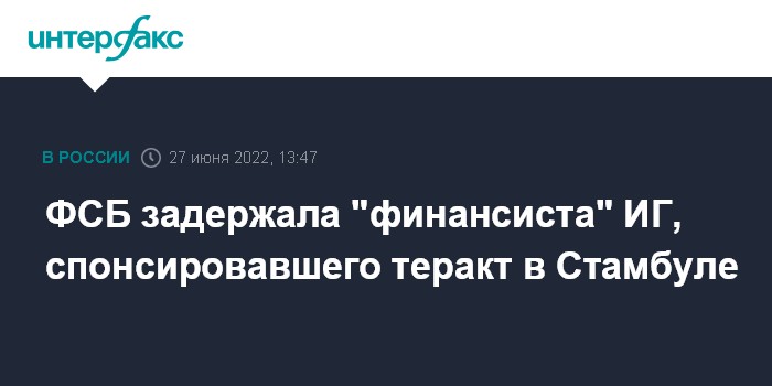 Москва. 27 июня. INTERFAX.RU - ФСБ сообщила о задержании гражданина РФ, переводившего деньги запрещённой в России террористической организации ИГИЛ, в том числе - на теракт в стамбульском клубе, в результате которого погибли почти сорок человек.