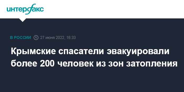 Москва. 27 июня. INTERFAX.RU - Более 200 жителей Крыма, большая часть из которых дети, эвакуированы из-за подтоплений после сильных ливней, сообщается на сайте ГУ МЧС России по республике в понедельник.