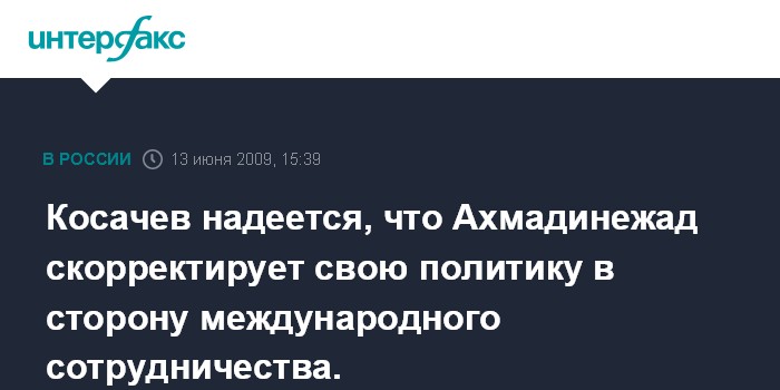 Москва. 13 июня. INTERFAX.RU - Глава международного комитета Госдумы РФ Константин Косачев выразил надежду на то, что Махмуд Ахмадинежад, побеждающий на президентских выборах в Иране, скорректирует свою политику в сторону международного сотрудничества.