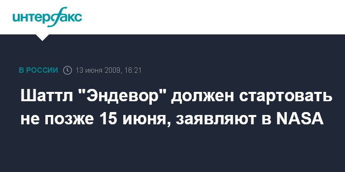 Москва. 13 июня. INTERFAX.RU - Американский шаттл "Эндевор" должен стартовать к Международной космической станции не позже понедельника, в ином случае запуск будет перенесен на более поздний срок, сообщил "Интерфаксу-АВН" в субботу представитель NASA в подмосковном Центре управления полетами Сергей Пузанов.