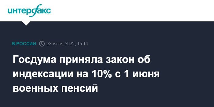 "Законом вносятся важные и принципиальные изменения в действующее законодательство. Так, в целях исполнения поручения президента РФ будет проиндексирован размер военной пенсии с 1 июня 2022 года на 10%", - сказал глава комитета Госдумы по обороне Андрей Картаполов журналистам.