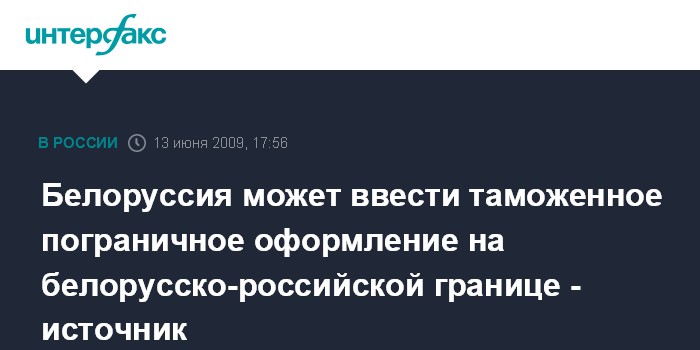 Минск. 13 июня. INTERFAX.RU - Президент Белоруссии Александр Лукашенко поручил подготовить предложения о введении в ближайшее время таможенного и пограничного оформления на белорусско-российской границе, аналогичное тому, которое осуществляет российская сторона, сообщил агентству "Интерфакс-Запад" в субботу источник в администрации главы белорусского государства.