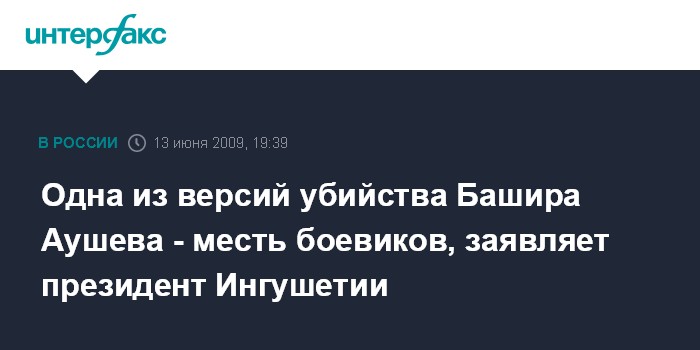Ростов-на-Дону. 13 июня. ИНТЕРФАКС-ЮГ - Причиной убийства бывшего секретаря Совбеза Ингушетии Башира Аушева может быть месть участников незаконных вооруженных формирований, заявил агентству "Интерфакс-Юг" в субботу президент республики Юнус-Бек Евкуров.