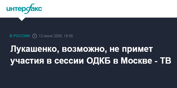 Минск. 13 июня. ИНТЕРФАКС-ЗАПАД - Президент Белоруссии Александр Лукашенко, возможно, не примет участия в сессии ОДКБ в Москве, сообщает Первый национальный телеканал белорусского телевидения в субботу.