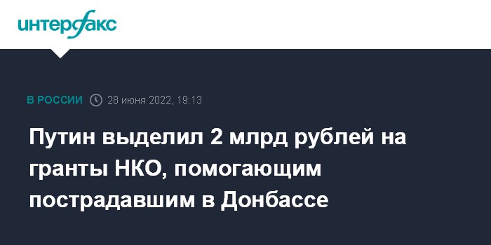 Москва. 28 июня. INTERFAX.RU - Президент Владимир Путин выделил дополнительные 2 млрд рублей Фонду президентских грантов на проведение в 2022 году внеочередного конкурса среди социально ориентированных некоммерческих организаций, помогающих пострадавшим в ходе конфликта в Донбассе, сообщила пресс-служба фонда.