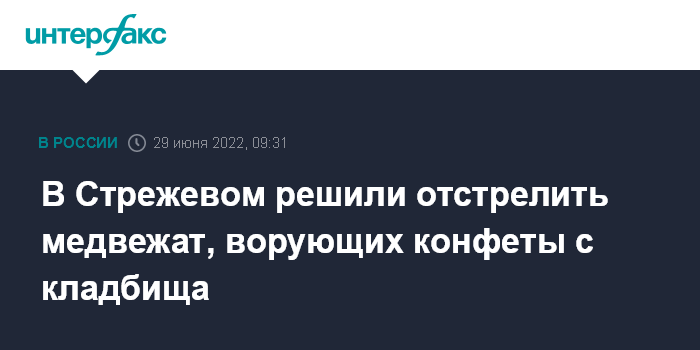 Москва. 29 июня. INTERFAX.RU - В городе Стрежевом чиновники приняли решение об отстреле трех медведей, которые зачастили на местное кладбище, чтобы собирать с могил конфеты и другие сладости, сообщил представитель департамента охотничьего и рыбного хозяйства Томской области Анатолий Истомин.