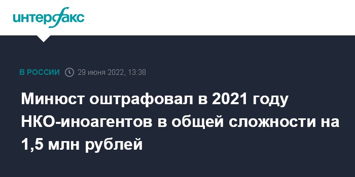 Москва. 29 июня. INTERFAX.RU - Общая сумма штрафов за неисполнение закона НКО-иноагентами в 2021 году составила 1,5 млн рублей, в среднем организации штрафуют на 100 тысяч рублей, сообщил на Петербургском международном юридическом форуме замдиректора департамента по делам некоммерческих организаций Минюста Роман Цыганов.