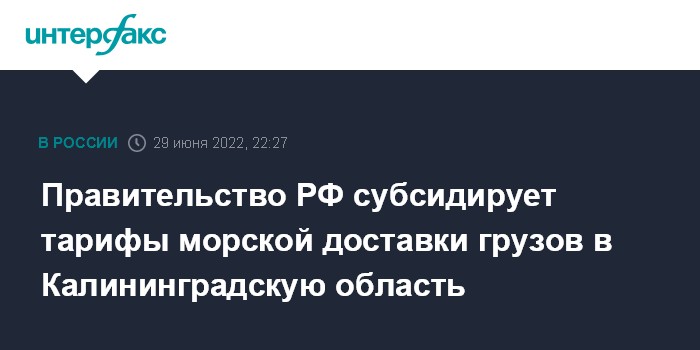 Москва. 29 июня. INTERFAX.RU - Правительство России будет субсидировать тарифы морской доставки грузов в Калининградскую область из портов на основной территории страны, сообщил губернатор Антон Алиханов в своем телеграм-канале.