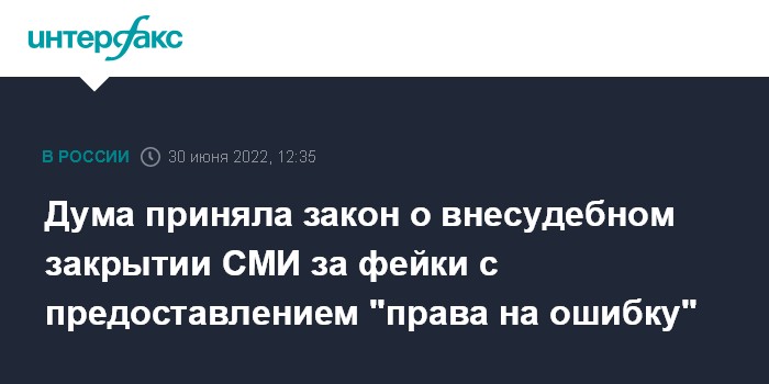 Москва. 30 июня. INTERFAX.RU - Госдума в четверг приняла в третьем, окончательном чтении закон о внесудебном закрытии СМИ за распространение фейков.
