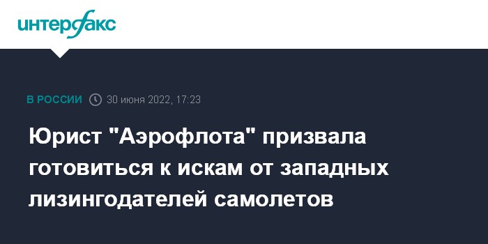 Москва. 30 июня. INTERFAX.RU - Западные лизингодатели, которые в соответствии с санкциями должны изъять самолеты у российских авиакомпаний, рано или поздно начнут предъявлять иски, и к ним нужно тщательно готовиться, считает первый замдиректора юридического департамента "Аэрофлота" Владислава Карельская-Зотова.