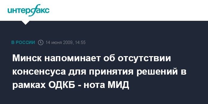 "14 июня 2009 года белорусская сторона передала в Секретариат Организации договора о коллективной безопасности (ОДКБ) официальную ноту, в которой сообщается, что в соответствии с пунктом 1 Правила 14 Правил процедуры органов ОДКБ, утвержденных Решением Совета коллективной безопасности ОДКБ о документах, регламентирующих деятельность ОДКБ от 18 июня 2004 года, неучастие Республики Беларусь в заседаниях Совета коллективной безопасности, Совета министров иностранных дел, Совета министров обороны, Комитета секретарей советов безопасности означает отсутствие согласия Республики Беларусь на принятие рассматриваемых этими органами решений и соответственно отсутствие консенсуса для принятия решений в соответствии с Правилом 14", -пояснили в белорусском внешнеполитическом ведомстве.