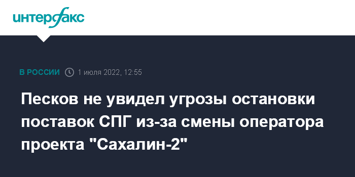 Москва. 1 июля. INTERFAX.RU - Угрозы остановки поставок сжиженного природного газа (СПГ) из-за смены оператора нефтегазового проекта "Сахалин-2" нет, заявил пресс-секретарь президента РФ Дмитрий Песков.