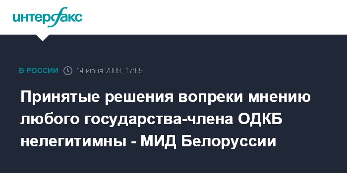 Минск. 14 июня. INTERFAX.RU - В Минске считают непозволительным игнорирование позиции государства-члена ОДКБ, называя принятые решения вопреки мнению любого государства нелегитимными.